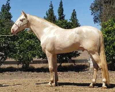Génotype Aa Ee CrCr gg he is double creme on a bay base and carries a chestnut gene. This means that all his offspring will be guaranteed to be dilute colors like Palomino or Buckskin with no chestnut or bay or grey (unless bred to a grey mare).